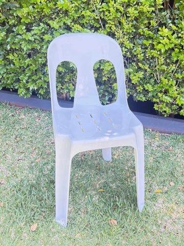 Stackable white plastic chairs. Commercial quality. 81cm tall.